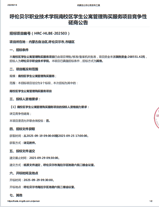 呼伦贝尔职业技术学院南校区学生公寓管理购买服务项目竞争性磋商公告